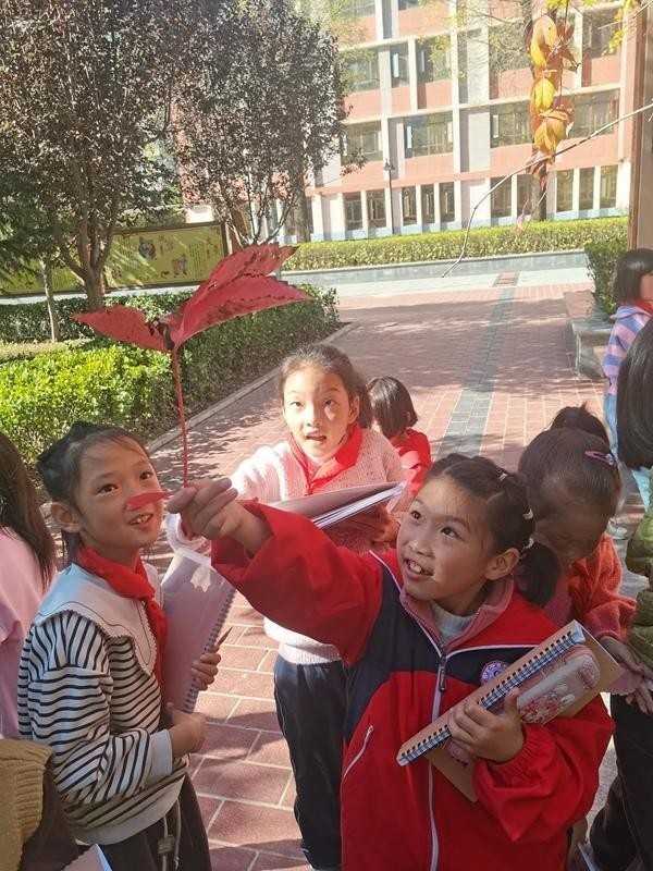 晨诵课学了一首写枫叶的小诗,泾川县第三小学的同学们下课后观察起了枫叶。受访者供图